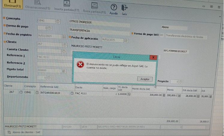 En ocasiones, el sistema Aspel Banco puede perder la conexión con la interfaz de Aspel, lo que provoca que los registros no se guarden correctamente. Como resultado, la operación se registra en SAE, pero no se refleja en Banco.