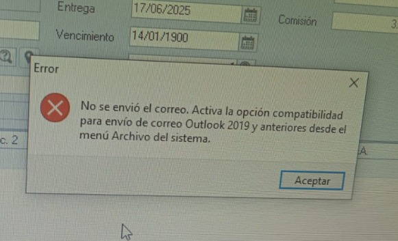 El mensaje indica que no fue posible enviar el correo. Existen dos tipos de errores comunes: uno ocurre cuando la configuración del correo es incorrecta, y otro, como en este caso, se presenta cuando Office no está instalado o no está habilitada la compatibilidad con Aspel SAE.