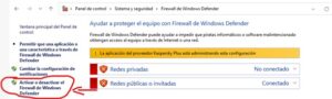1.- Firewall: Entrando a panel de control, sistemas de seguridad seleccionando el firewall Windows defender Podemos ver si esta activo si es así hay que desactivarlo en la opción activar o desactivar el Windows defender.
